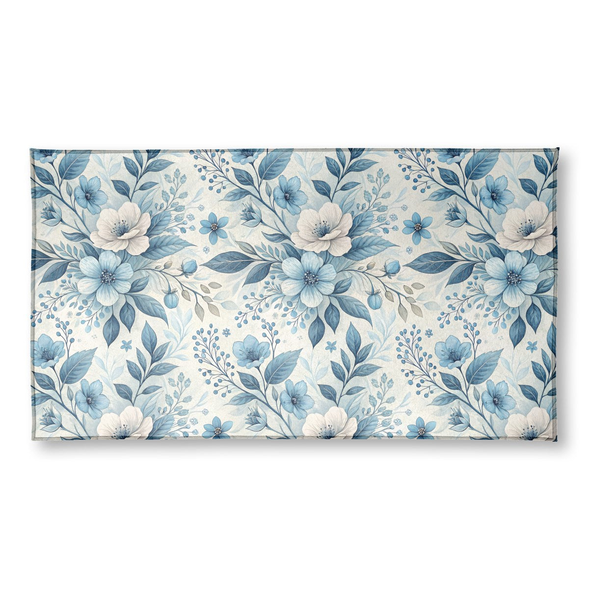 An elegant watercolor-style illustration of a floral pattern. The serene composition features delicate blue and white flowers, deep blue leaves, and small berries intertwined on a light, textured background, creating a classic and tranquil design.