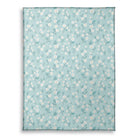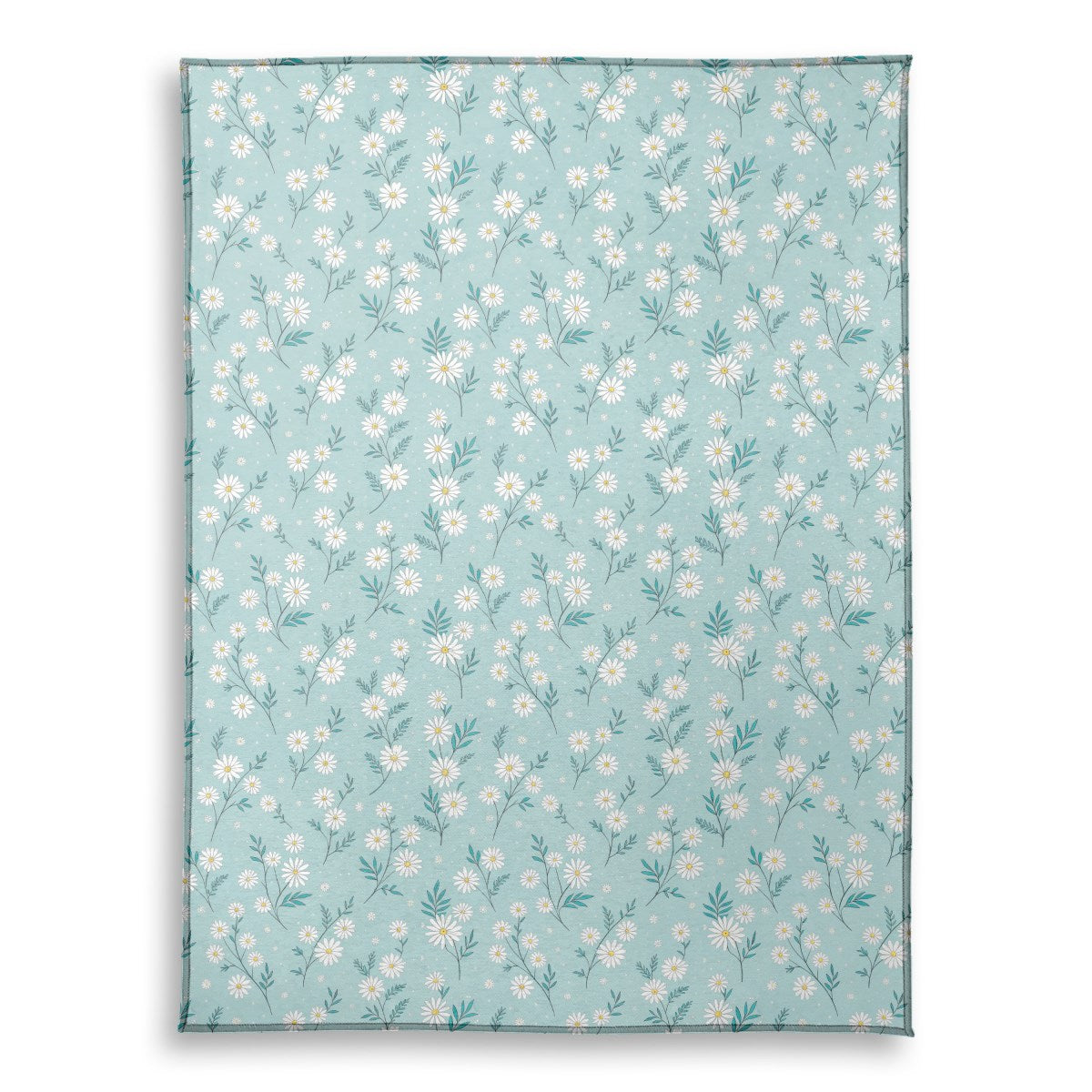 This is an illustrated, seamless pattern of delicate white daisies with yellow centers and teal leaves. The charming flowers are scattered across a speckled, light blue background, creating a fresh and whimsical design.