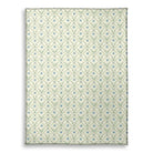 A seamless botanical pattern featuring a light green diagonal trellis on a cream background. The diamond shapes contain alternating motifs of a single blue flower and a leafy green sprig, creating a delicate, vintage-inspired design suitable for wallpaper or fabric.
