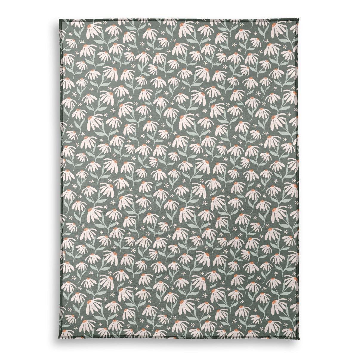 This is a seamless floral pattern featuring stylized white daisies with orange-dotted centers and light green leaves. The simple, graphic flowers are scattered across a dark, muted green background, creating a charming and slightly retro design.