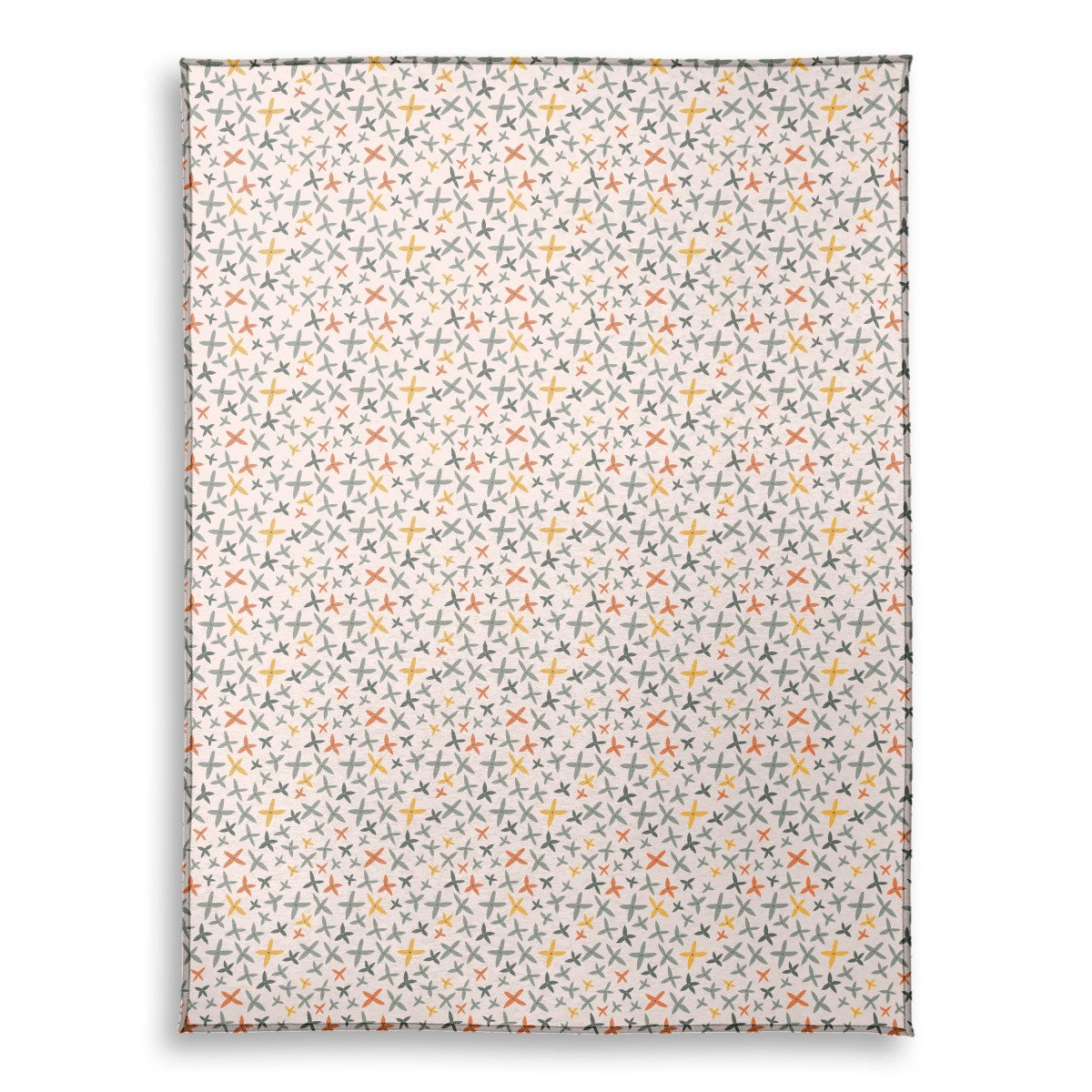A seamless, modern pattern of stylized four-petaled flowers in varying sizes. The design features a muted, earthy color palette of green, orange, and yellow scattered playfully across a light, off-white background for a whimsical and abstract look.