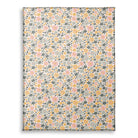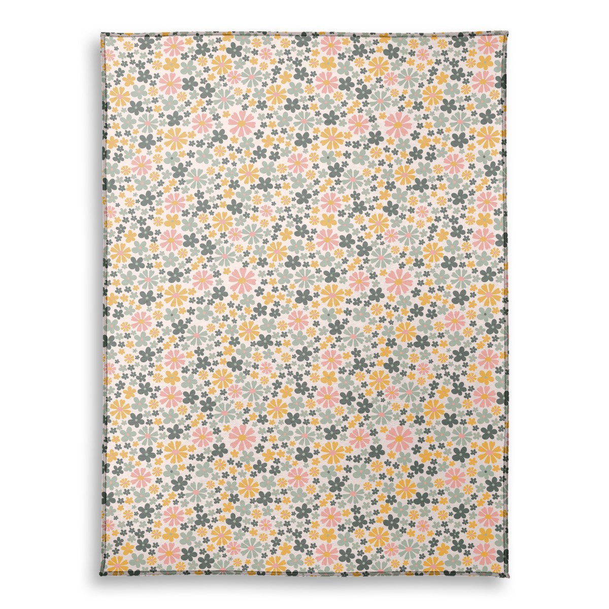 A retro-inspired, seamless pattern of stylized flowers. The ditsy floral print uses a muted color palette of pink, mustard yellow, sage, and dark green against a cream background, creating a groovy, 1970s aesthetic.