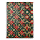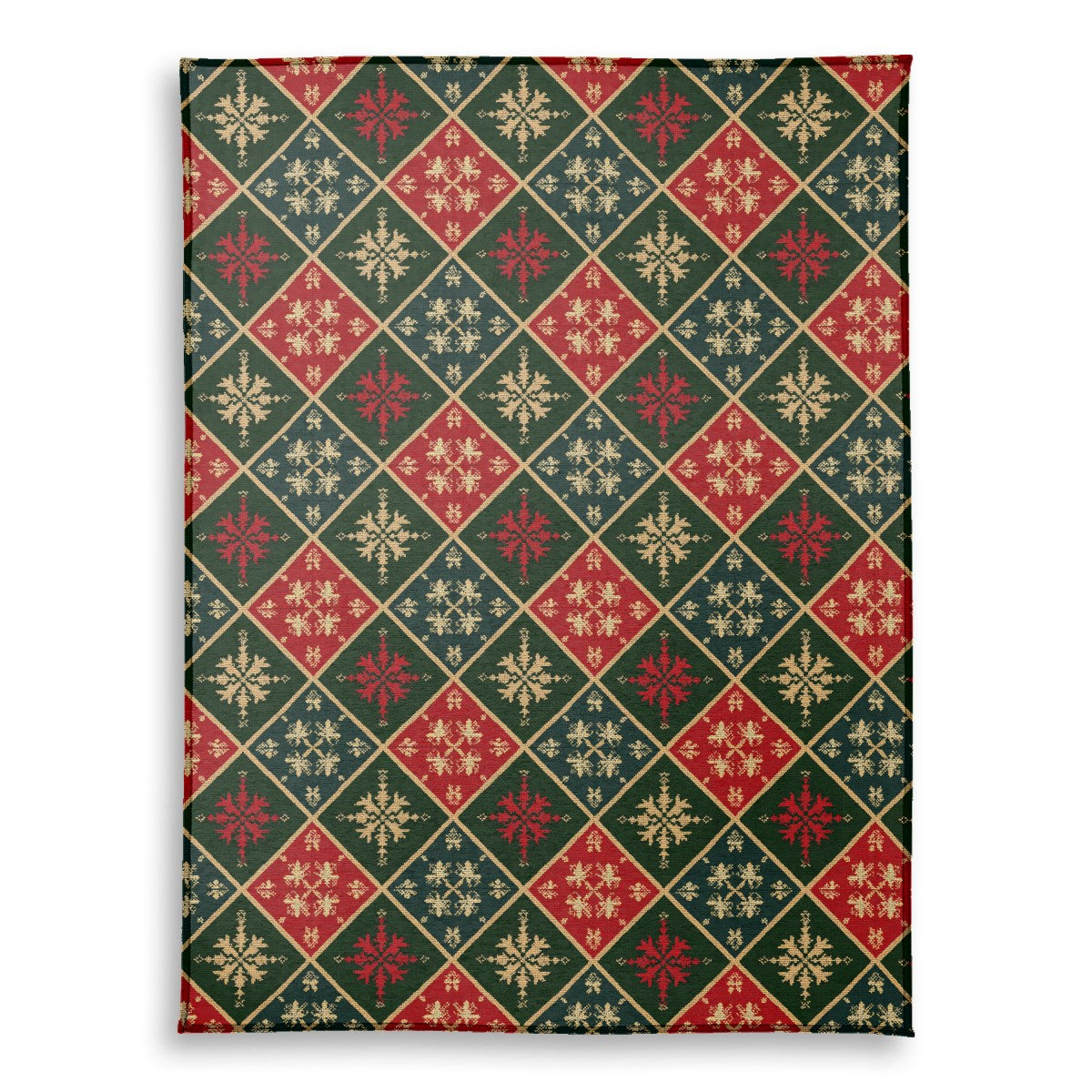 A festive, knitted textile pattern featuring red, green, and dark blue diamonds outlined in gold. Each diamond contains intricate snowflake motifs, evoking the cozy feel of a traditional Christmas sweater or tapestry.