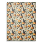 A vintage-style seamless pattern features black cats with glowing orange eyes perched on pumpkins. Swirling green vines and leaves connect the elements on a textured, light background, creating a classic Halloween-themed illustration with a slightly spooky feel.
