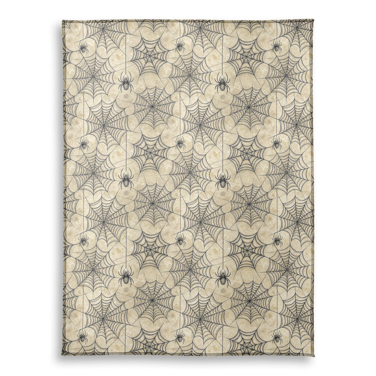 This vintage-style illustration features an intricate, repeating pattern of black spiderwebs on a textured, parchment-like background. Two detailed spiders are present, one crawling on a web and another dangling from a thread, creating a classic spooky or Halloween-themed design.