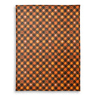 A whimsical, seamless Halloween pattern featuring a diagonal plaid in orange, black, and brown. The design is scattered with hand-drawn, cartoonish skulls, jack-o'-lanterns, and other small autumnal motifs, creating a festive and spooky-cute feel.