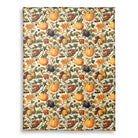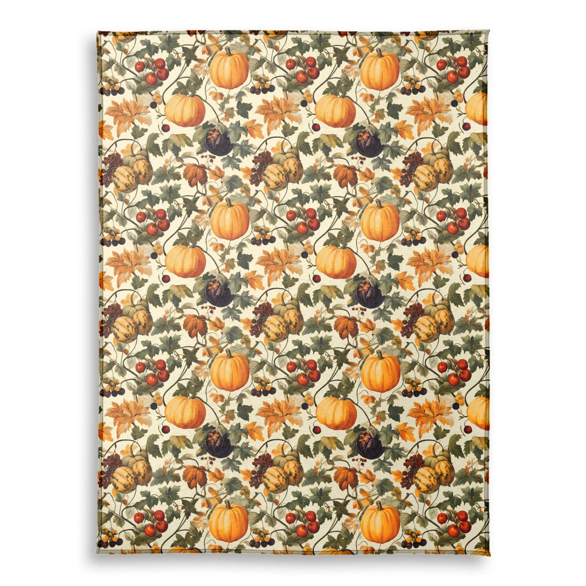 A vintage-style pattern illustrates a bountiful autumn harvest. Orange pumpkins, mottled gourds, grapes, and berries are interwoven with colorful fall leaves and twisting vines against a cream background, evoking a sense of seasonal abundance.