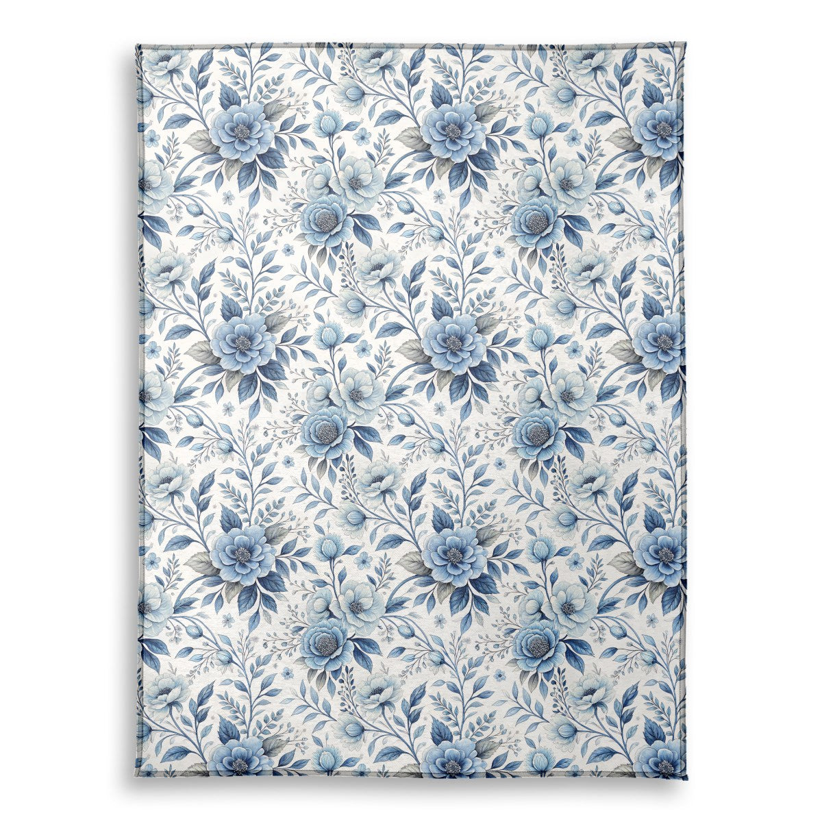 This image displays a seamless floral pattern with elegant, watercolor-style illustrations. Various blue flowers, from light to deep indigo, are intertwined with matching leaves and stems on a clean white background, creating a classic and delicate botanical design.