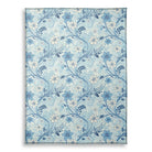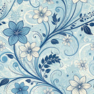 An elegant, seamless pattern of stylized flowers and swirling vines. The intricate design features a classic color palette of blue, navy, and cream against a light blue background, creating a delicate and decorative composition.
