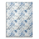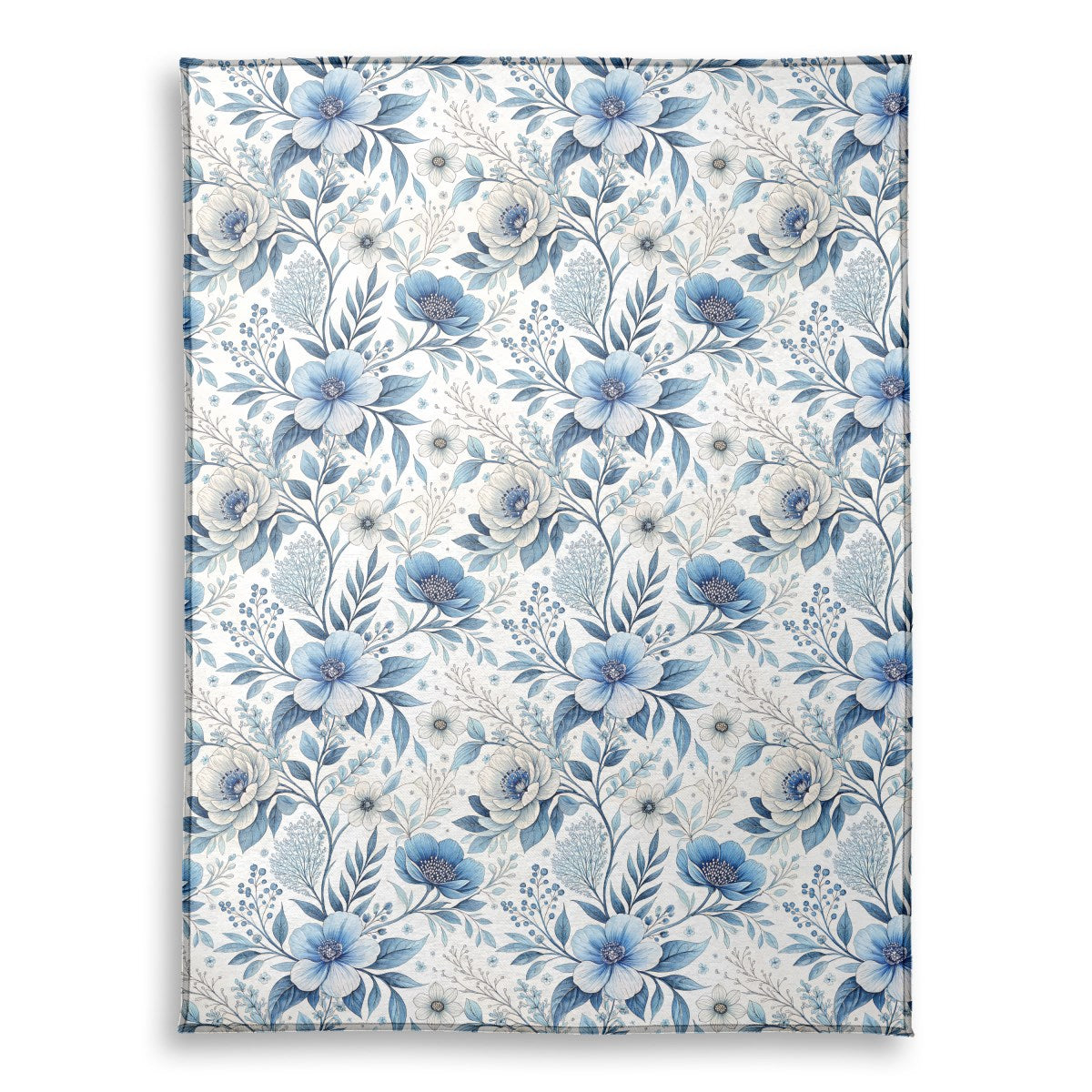 This is a delicate and intricate floral pattern featuring blue and white flowers, leaves, and berries. Rendered in a watercolor and ink-line style against a white background, the design creates a timeless and elegant botanical illustration.