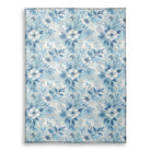 This watercolor illustration depicts a delicate floral pattern. White flowers with dark centers and deep blue leaves are intertwined on winding stems. The composition is set against a soft, mottled light blue background, creating a serene and elegant design.