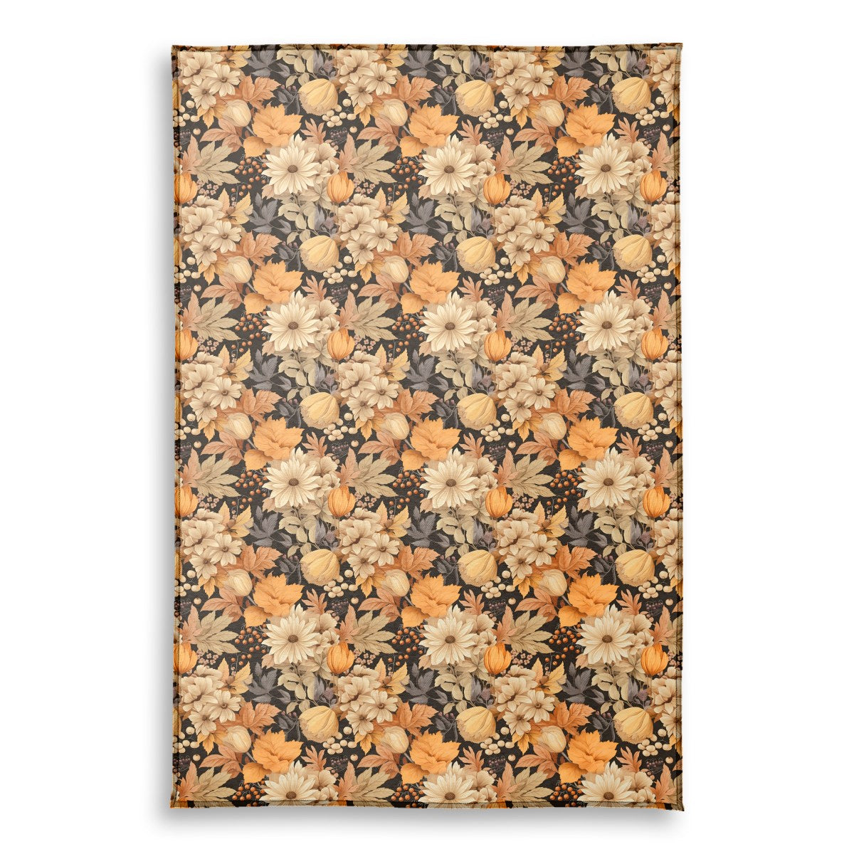 This is a seamless botanical pattern featuring autumn flora. A warm palette of orange, cream, and muted tones for flowers, leaves, and berries is set against a dark background, creating a rich, elegant, and vintage-inspired design with a cozy, autumnal feel.