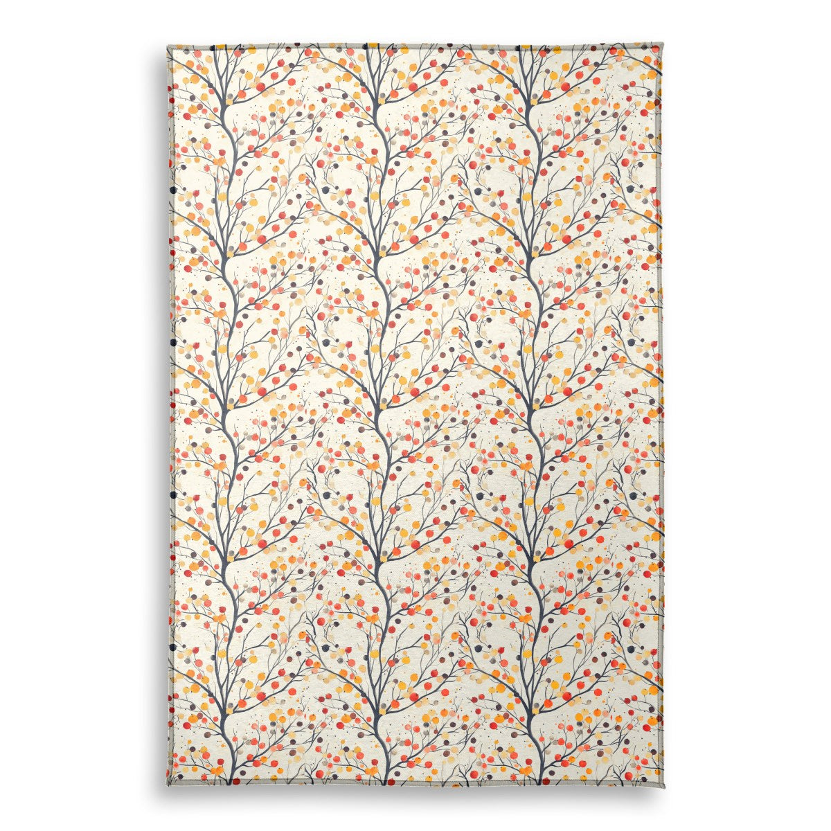 A whimsical, stylized illustration of a tree with dark, slender branches. It is adorned with round, colorful leaves or berries in warm autumnal hues of red, orange, and yellow against a light, speckled background, evoking a watercolor-style aesthetic.