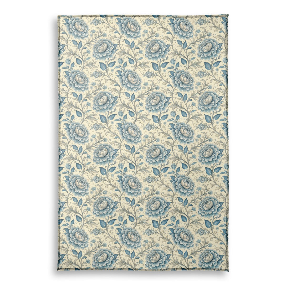 An elegant, traditional floral pattern featuring large, detailed blue and cream peonies. The flowers are interwoven with scrolling grey and blue vines on a dotted, pale yellow background, creating a sophisticated, vintage-inspired design suitable for textiles or wallpaper.