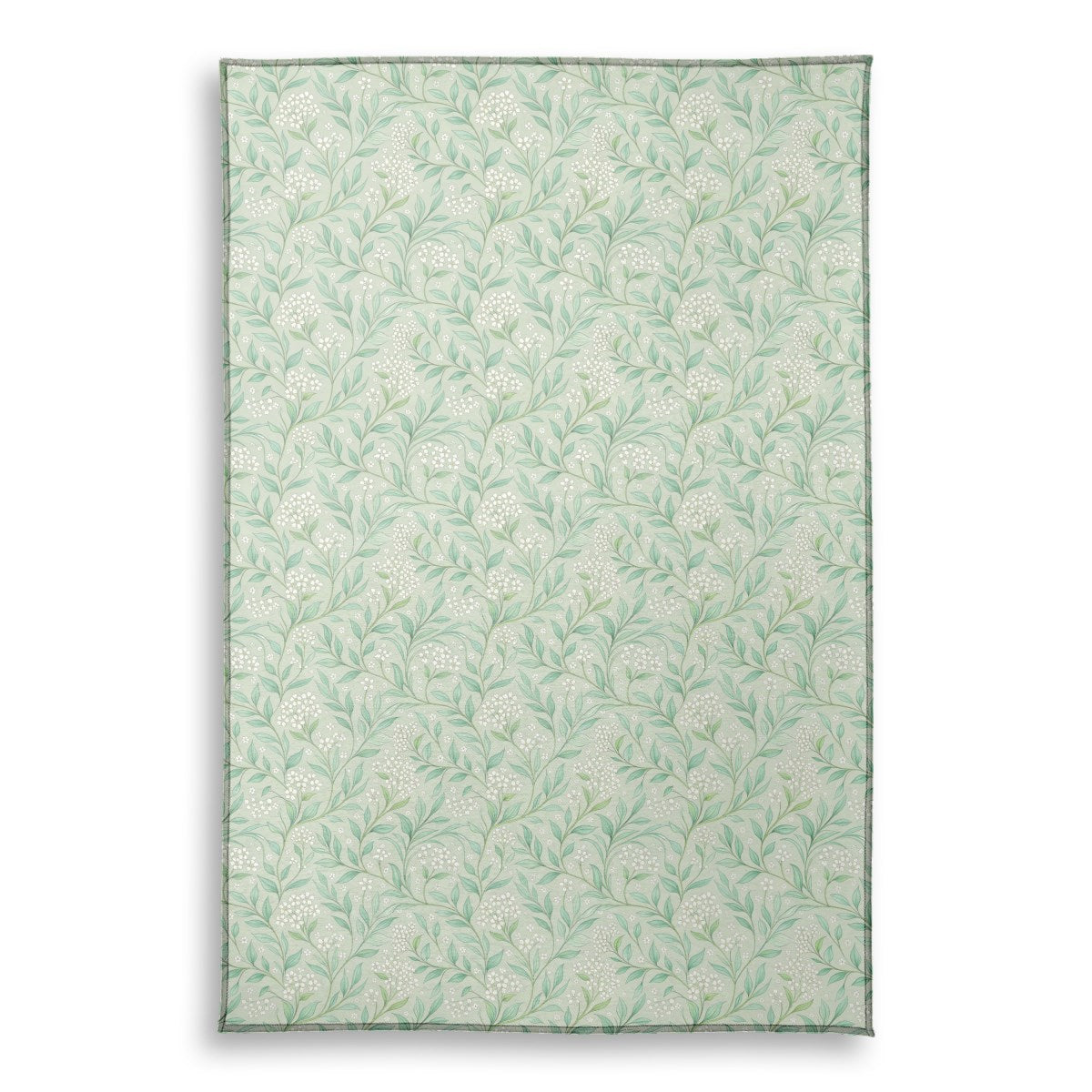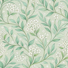 A serene, seamless botanical pattern of delicate white flowers and gracefully swirling green leaves. The elegant, illustrative design is set against a soft sage green background, creating a timeless and tranquil aesthetic with an Art Nouveau influence.