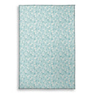 This is an illustrated, seamless pattern of delicate white daisies with yellow centers and teal leaves. The charming flowers are scattered across a speckled, light blue background, creating a fresh and whimsical design.