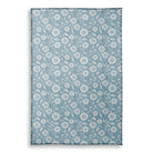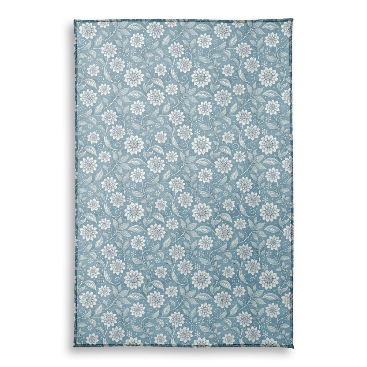 This is a seamless, monochromatic floral pattern featuring stylized white and gray flowers with swirling stems and leaves. Set against a textured, muted blue background, the elegant design has an intricate, embossed quality, giving it a vintage, decorative appearance.