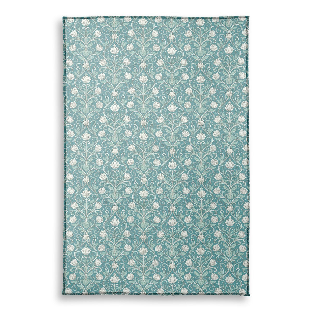 An elegant, symmetrical floral pattern in the Art Nouveau style. Stylized white and mint-green flowers are connected by swirling vines on a rich teal background, creating an intricate and decorative design reminiscent of vintage wallpaper.