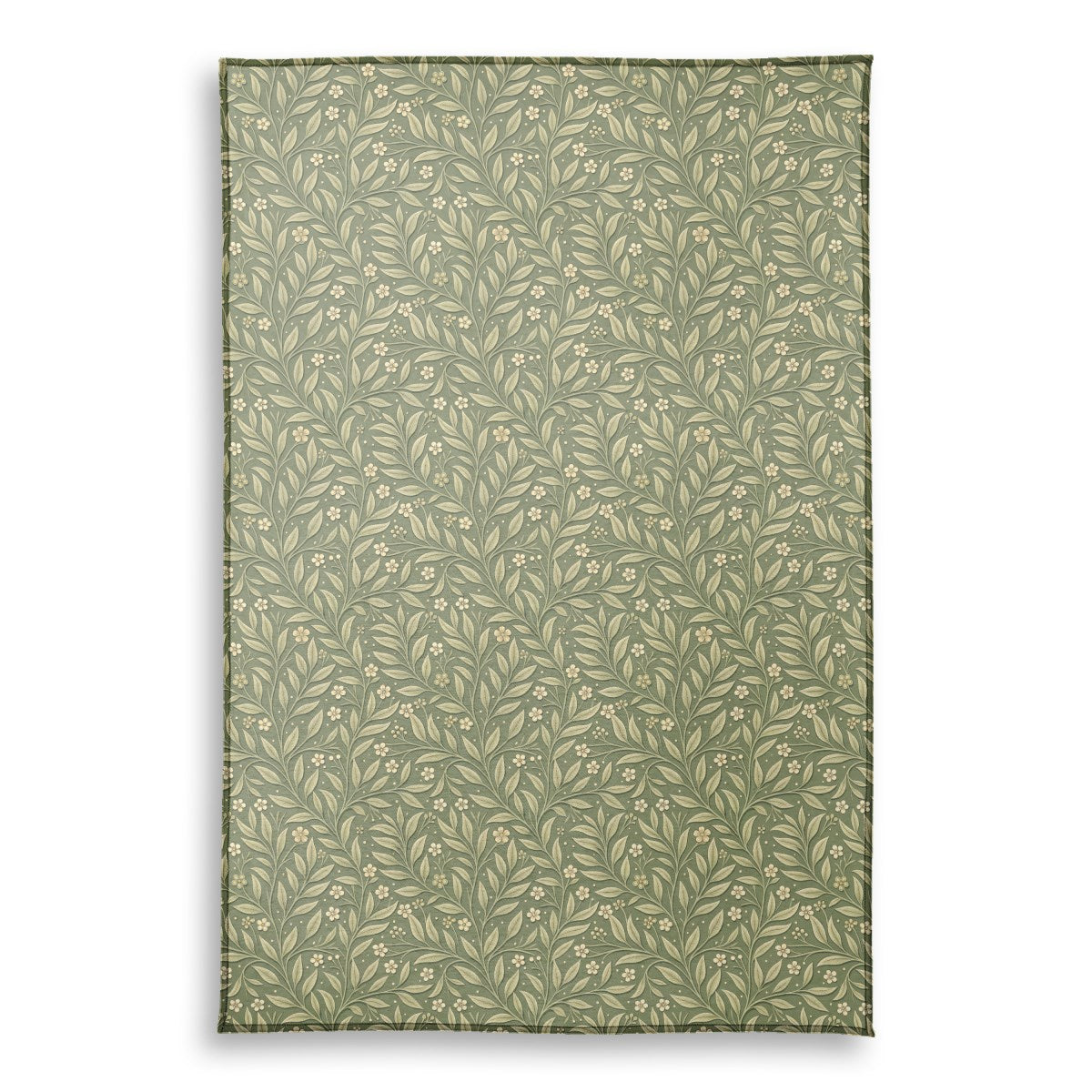 An elegant, Arts and Crafts-style botanical pattern featuring intertwining vines with veined leaves and small cream flowers. The seamless design is set against a dark sage green background, giving it a classic, embossed wallpaper appearance with a subtle three-dimensional quality.