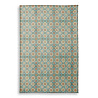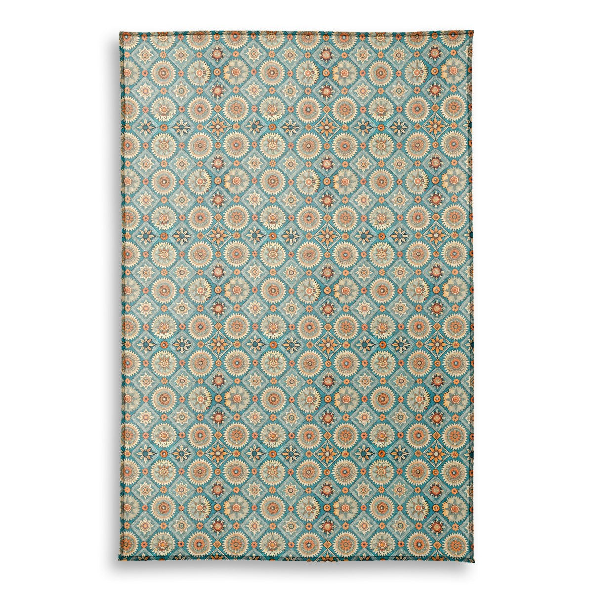 A vibrant, bohemian tile pattern features intricate sun and floral mandalas. The detailed orange, cream, and beige motifs are set within ornate diamond shapes on a rich teal background, creating a decorative, folk-art feel.