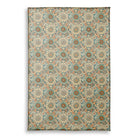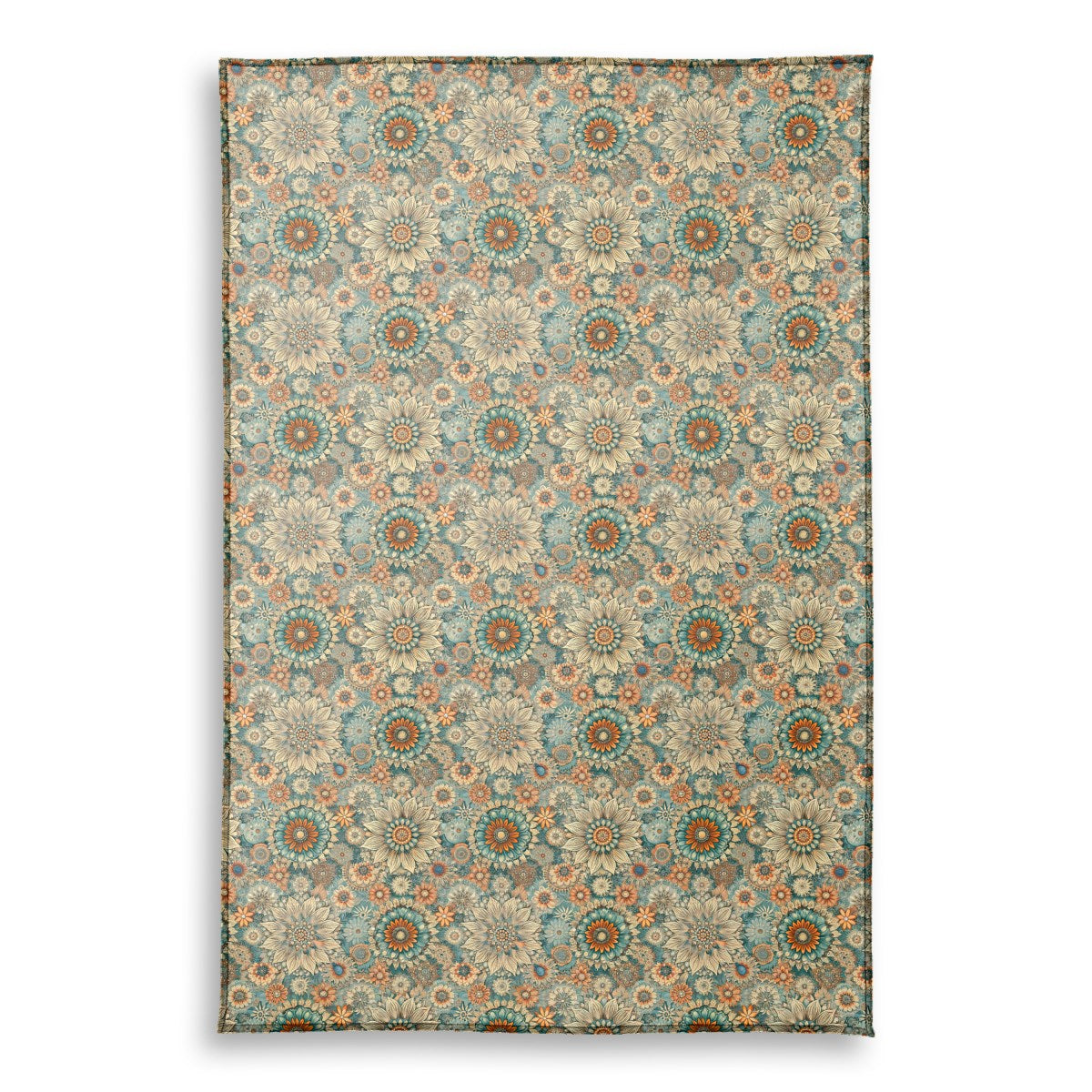 A dense, retro-style floral pattern features intricately detailed flowers. The busy, repeating design uses a striking color palette of teal, orange, and cream, creating a rich and decorative visual tapestry with a vintage, illustrative feel.