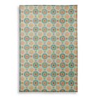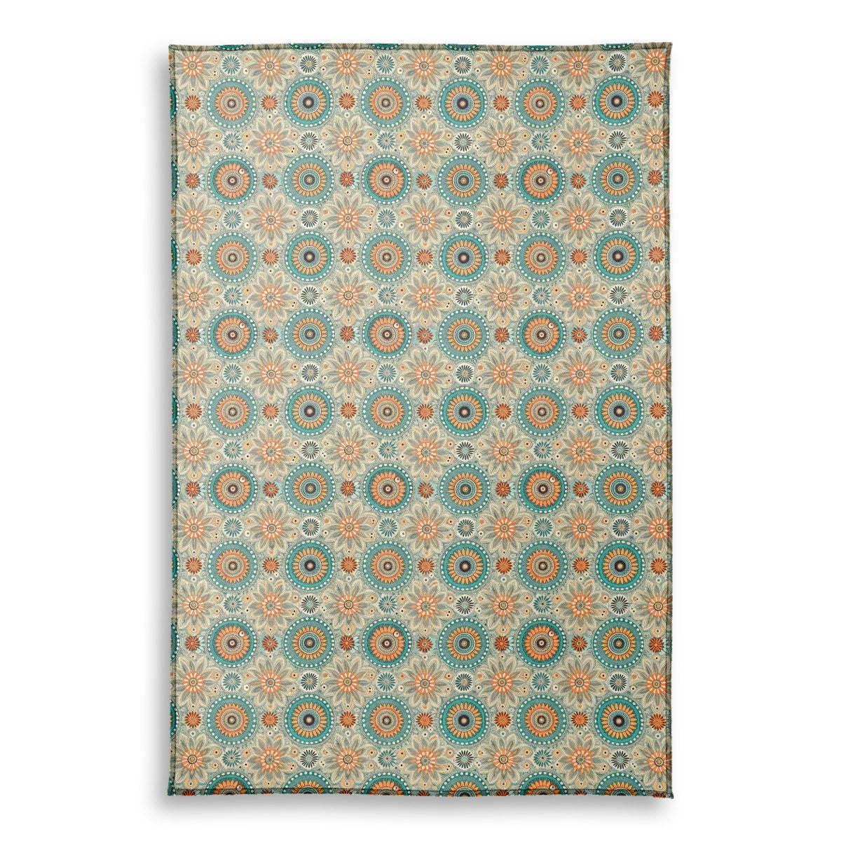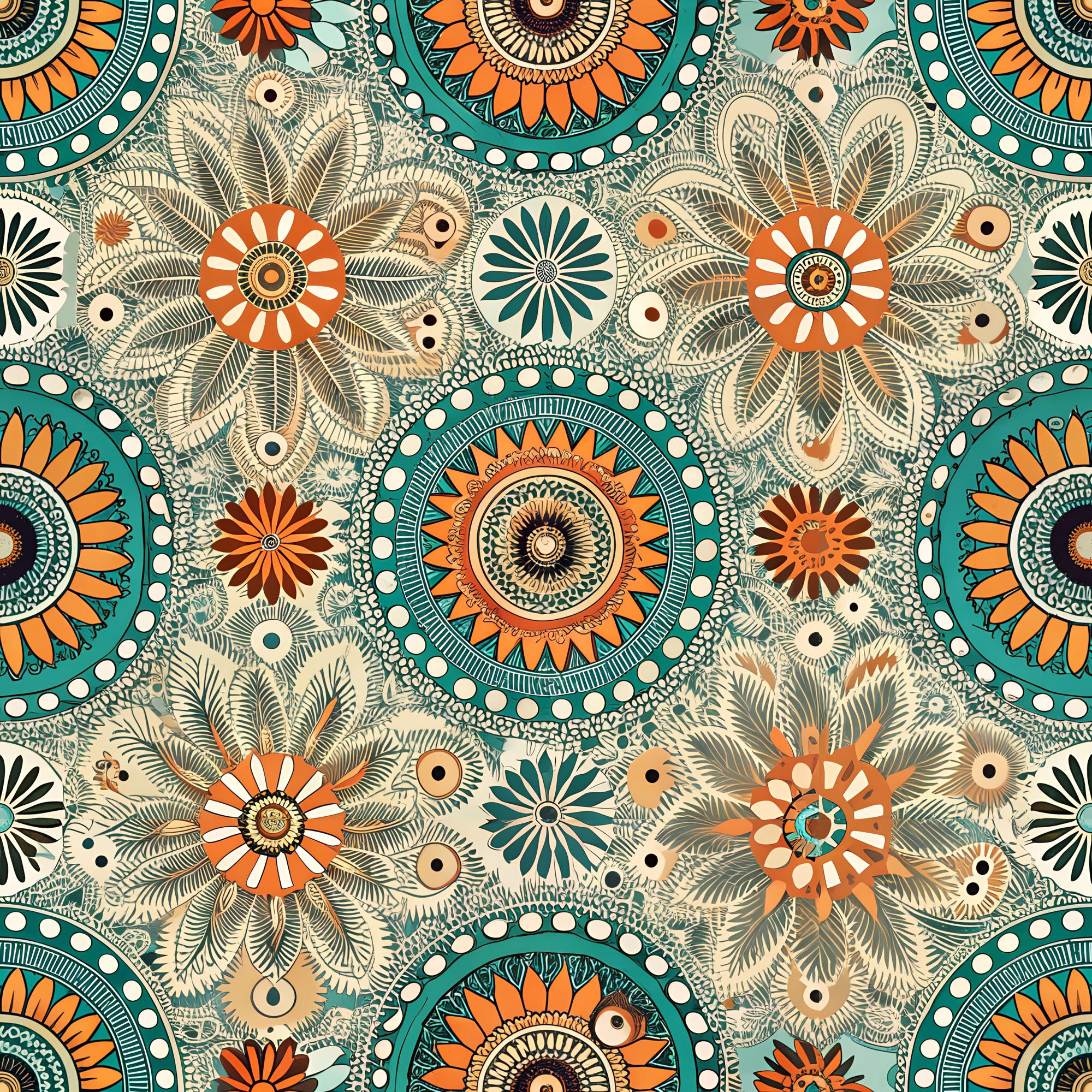 This is a vibrant, repeating pattern featuring intricate mandalas and stylized flowers in a bohemian, folk-art style. The design uses a striking color palette of teal, orange, and cream, with detailed line work and dotted textures creating a rich, layered effect.