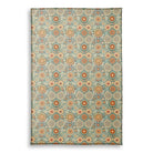 A vibrant, bohemian-style floral pattern featuring intricate, mandala-like flowers and stylized leaves. The rich color palette of teal, orange, and cream creates a warm, retro aesthetic on a dense, folk-art-inspired background.