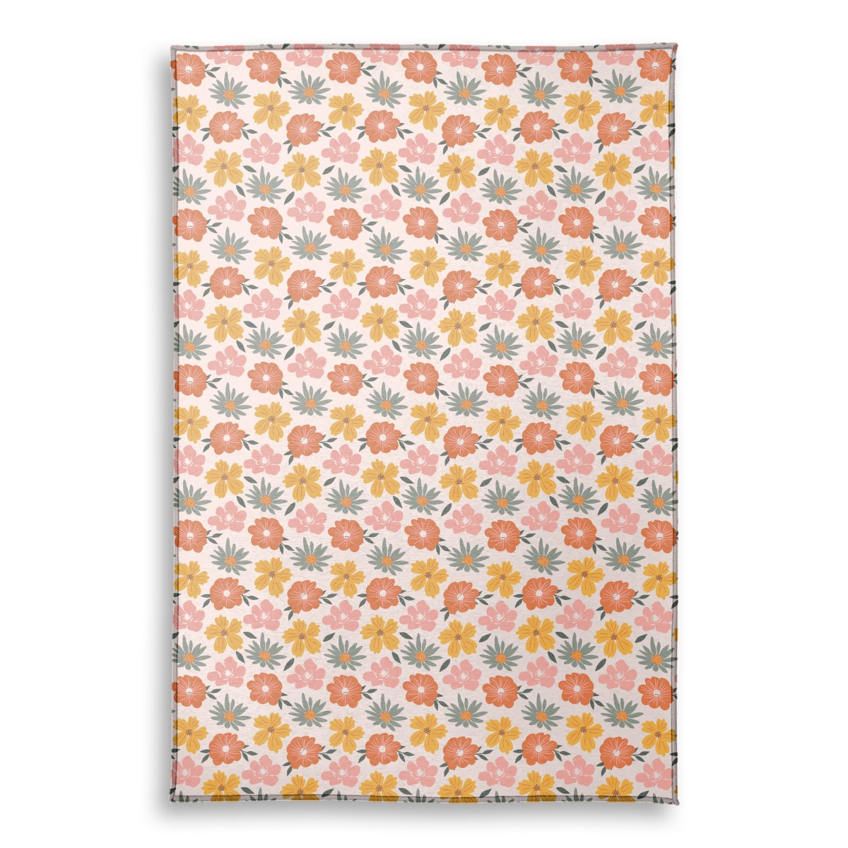 A seamless floral pattern featuring stylized, hand-drawn flowers. The design uses a warm, retro color palette of pink, terracotta, mustard yellow, and sage green on a light cream background, creating a charming and modern look.