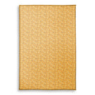 This is a seamless floral pattern featuring small, stylized flowers in white, brown, and rust-orange scattered across a solid mustard-yellow background. Some flowers have tiny green leaves, creating a warm, rustic design.