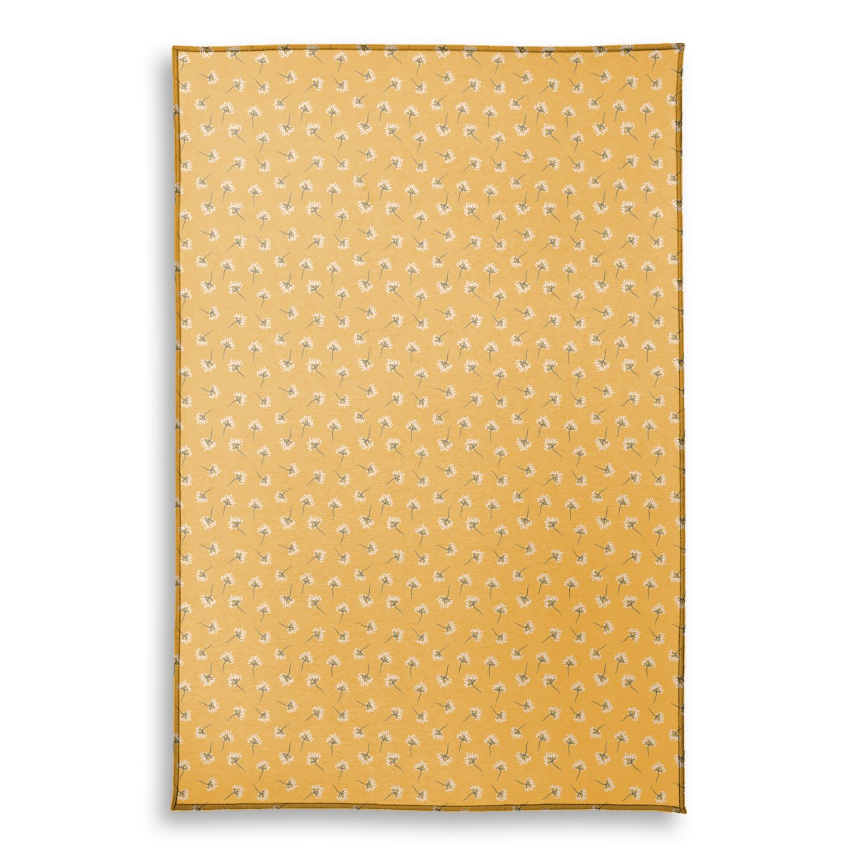 A repeating pattern of stylized white flowers with dark stems scattered across a solid mustard-yellow background. The simple, whimsical floral design has a modern, graphic feel, creating a cheerful and charming aesthetic.