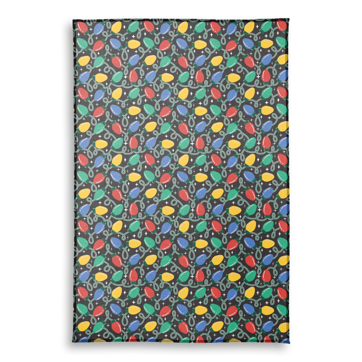 A festive, repeating pattern of colorful Christmas lights. The red, blue, green, and yellow bulbs are strung on looping white wires against a black background. White sparkles add a touch of magic to the cheerful, retro-style holiday design.