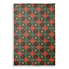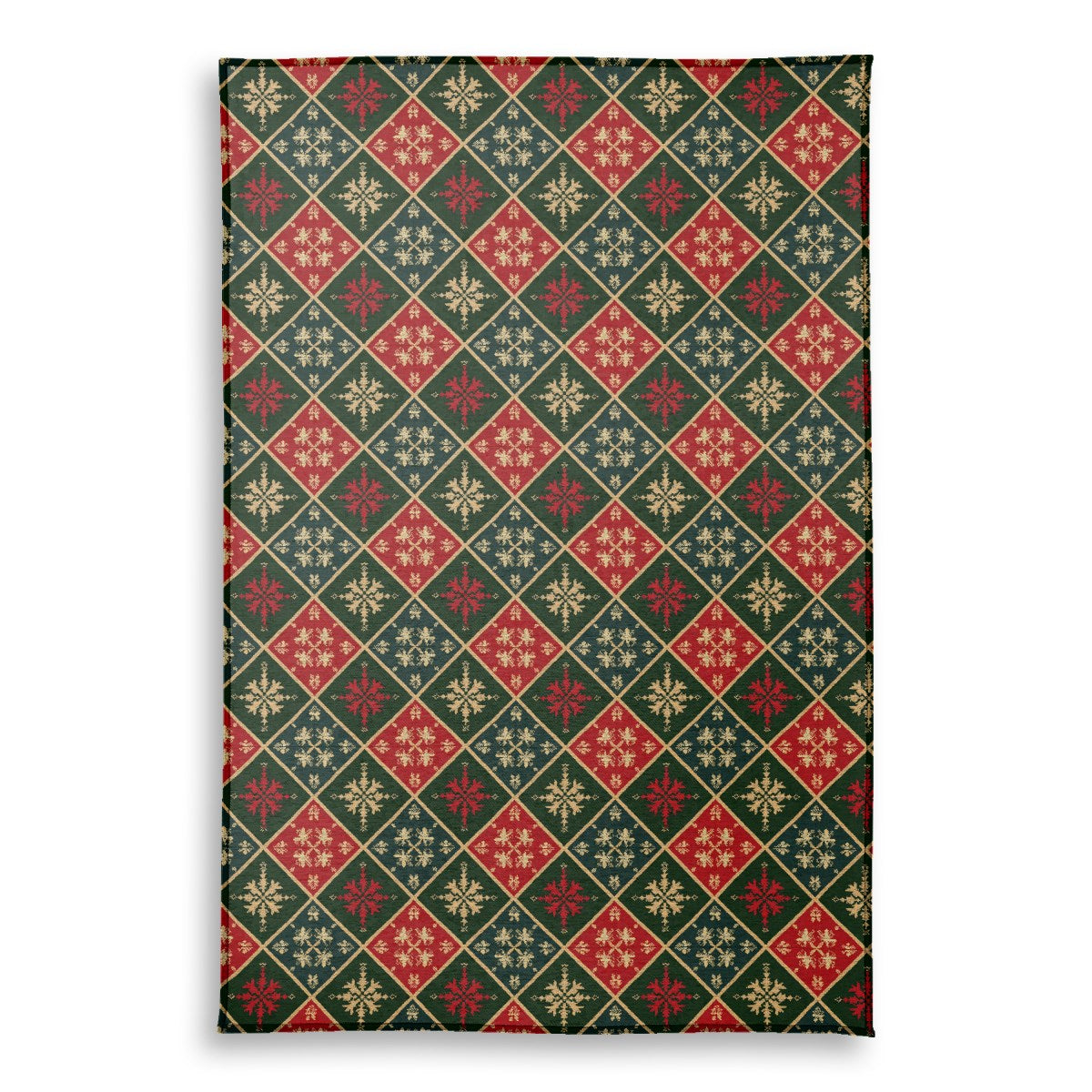 A festive, knitted textile pattern featuring red, green, and dark blue diamonds outlined in gold. Each diamond contains intricate snowflake motifs, evoking the cozy feel of a traditional Christmas sweater or tapestry.