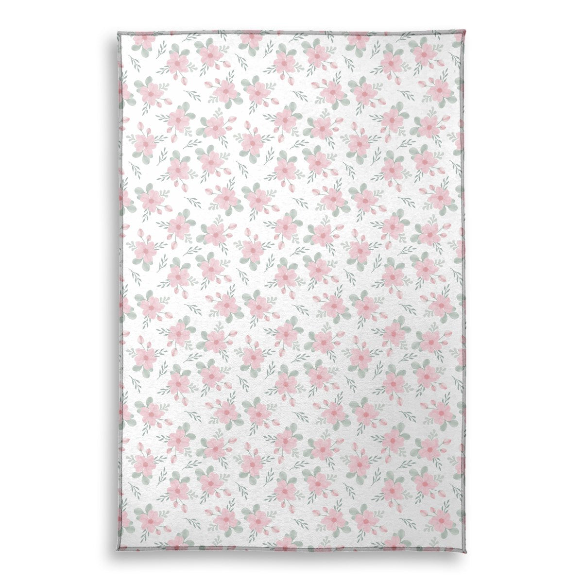 A seamless watercolor pattern featuring delicate pink flowers, buds, and sage green leaves. The gentle floral elements are scattered across a clean white background, creating a soft, elegant, and charming design suitable for textiles or wallpaper.
