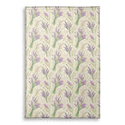 This is a watercolor-style botanical pattern of purple lavender. Bouquets and loose sprigs are scattered across a textured, light beige background. A prominent bunch tied with a yellow ribbon creates a central focus in this charming, rustic design.