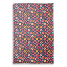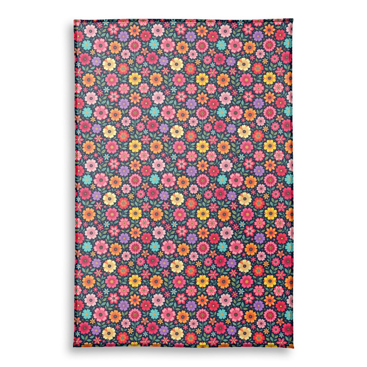 A vibrant, seamless pattern of stylized, colorful flowers in shades of pink, red, orange, and purple. The cheerful blossoms and green leaves pop against a dark navy-blue background, creating a dense and lively folk-art-inspired design.