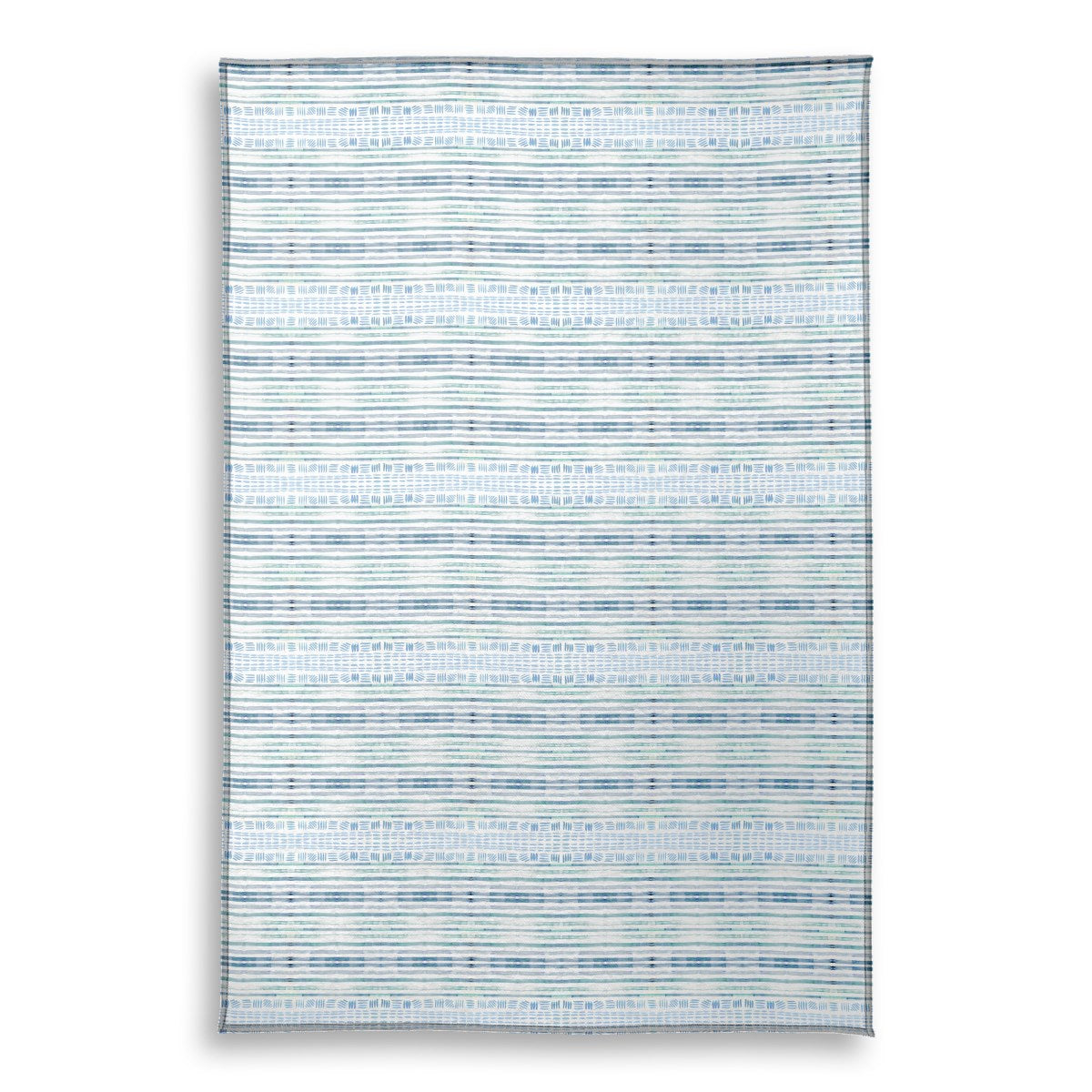 The image is a watercolor painting featuring a repeating pattern. The main design consists of broad horizontal stripes in varying shades of blue and teal, interspersed with thinner stripes of white. A central band displays a more intricate pattern of smaller, stylized shapes, including dashes, dots and small oblong forms, also in varying shades of blue. The overall effect is a harmonious blend of simple stripes and a more textured, almost tribal-inspired pattern. The color palette is cool and calming, emphasizing shades of blue and teal against a white background. The pattern is symmetrical, reflecting across both the horizontal and vertical axes.