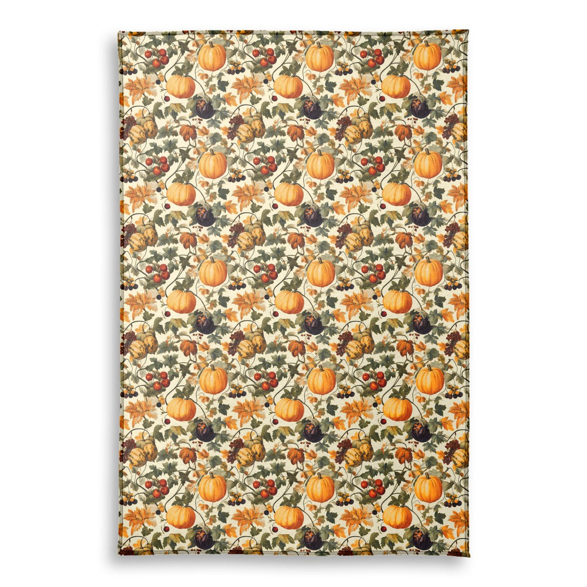 A vintage-style pattern illustrates a bountiful autumn harvest. Orange pumpkins, mottled gourds, grapes, and berries are interwoven with colorful fall leaves and twisting vines against a cream background, evoking a sense of seasonal abundance.