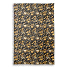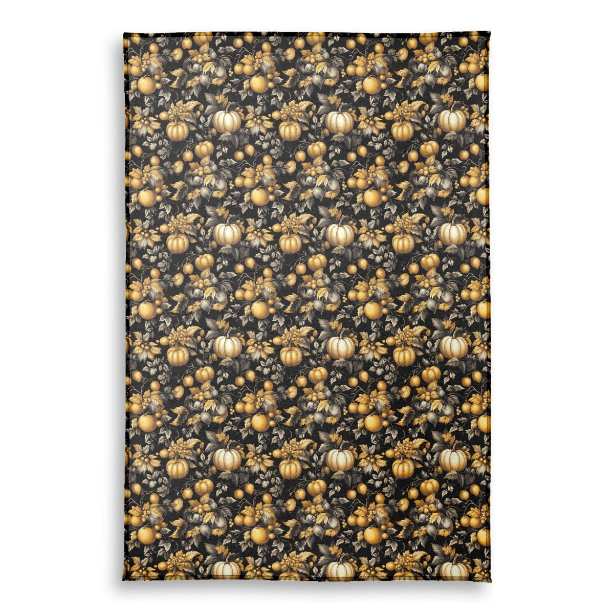 A luxurious, vintage-style pattern of autumnal fruits and foliage. Rendered in a detailed engraving style, golden pumpkins, apples, and grapes contrast richly with silver-toned leaves against a dramatic black background, creating an opulent and seamless design.