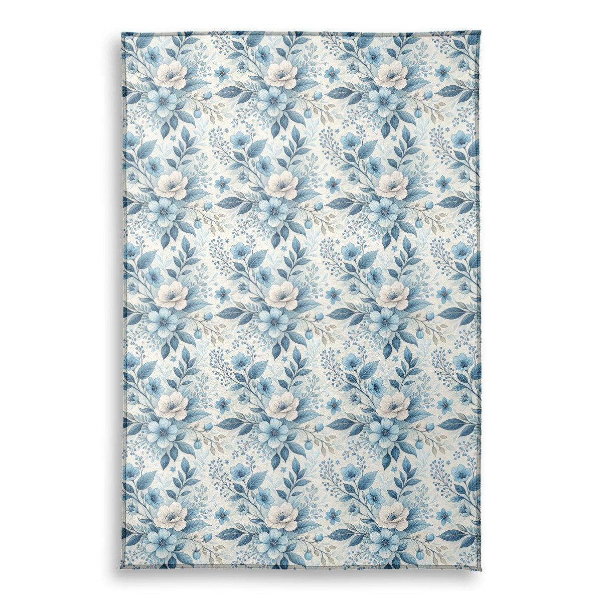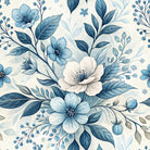 An elegant watercolor-style illustration of a floral pattern. The serene composition features delicate blue and white flowers, deep blue leaves, and small berries intertwined on a light, textured background, creating a classic and tranquil design.