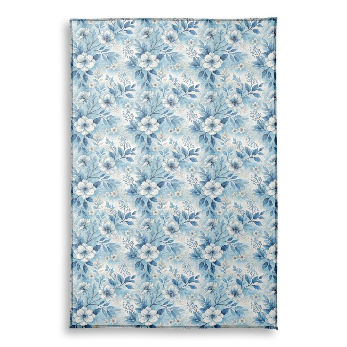 This watercolor illustration depicts a delicate floral pattern. White flowers with dark centers and deep blue leaves are intertwined on winding stems. The composition is set against a soft, mottled light blue background, creating a serene and elegant design.