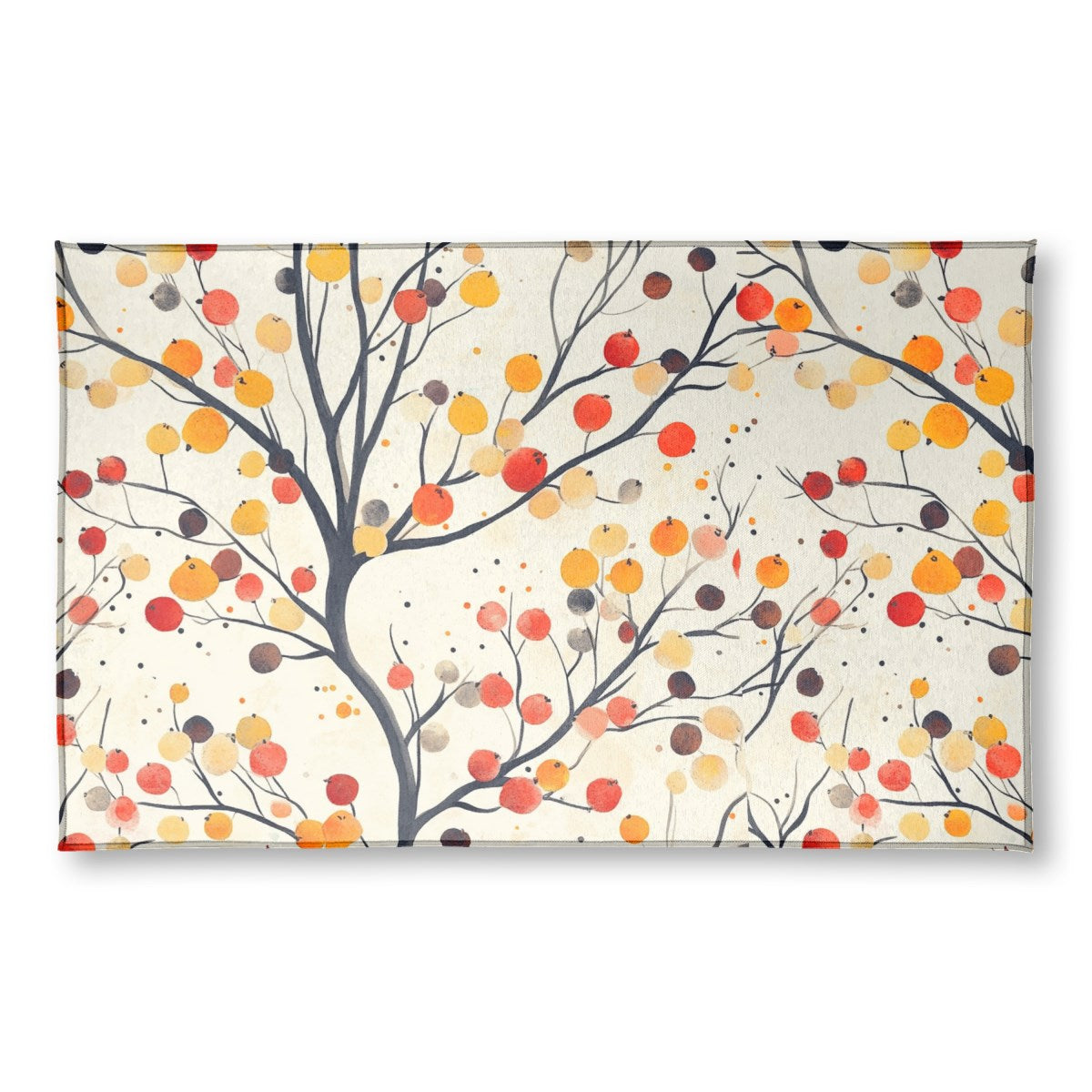 A whimsical, stylized illustration of a tree with dark, slender branches. It is adorned with round, colorful leaves or berries in warm autumnal hues of red, orange, and yellow against a light, speckled background, evoking a watercolor-style aesthetic.