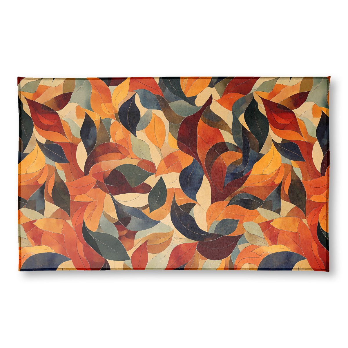 A stylized, abstract pattern of overlapping autumn leaves fills the frame. A rich, warm palette of orange, red, and brown is contrasted by deep blues and dark greens, creating a dynamic, mosaic-like texture reminiscent of stained glass.