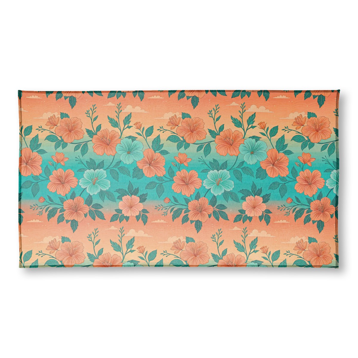 A vibrant, retro-style pattern of orange and teal hibiscus flowers with dark green leaves. The background is a stylized sunset gradient, shifting from warm orange to cool turquoise, with subtle clouds creating a serene, tropical atmosphere.