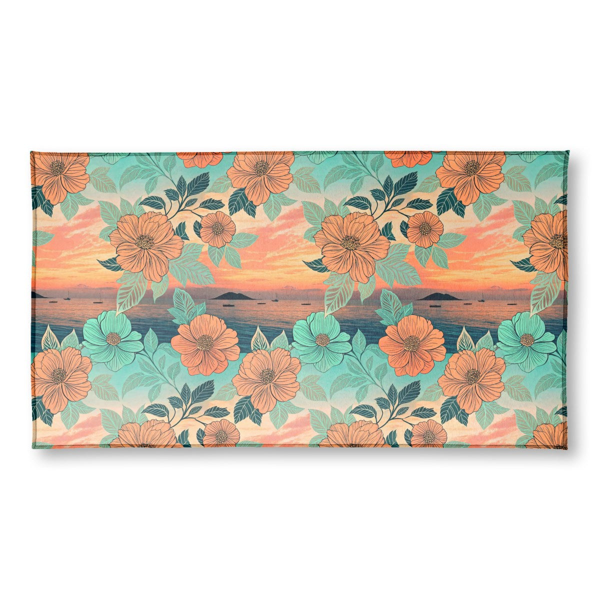 This composite image blends a stylized floral pattern with a realistic ocean sunset. Bold orange and turquoise flowers are overlaid on a serene seascape featuring sailboats and distant islands under a vibrant, cloudy sky, creating a unique artistic collage.