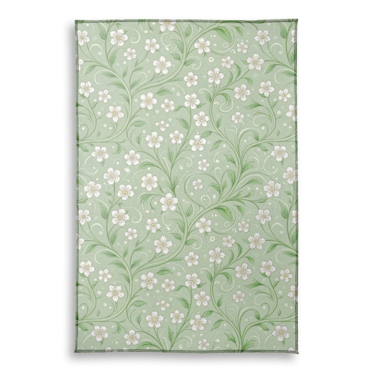 A vintage-style seamless pattern featuring delicate white flowers on gracefully swirling green vines. The intricate, elegant design is set against a soft, muted sage green background with subtle decorative swirls, creating a classic and serene composition.