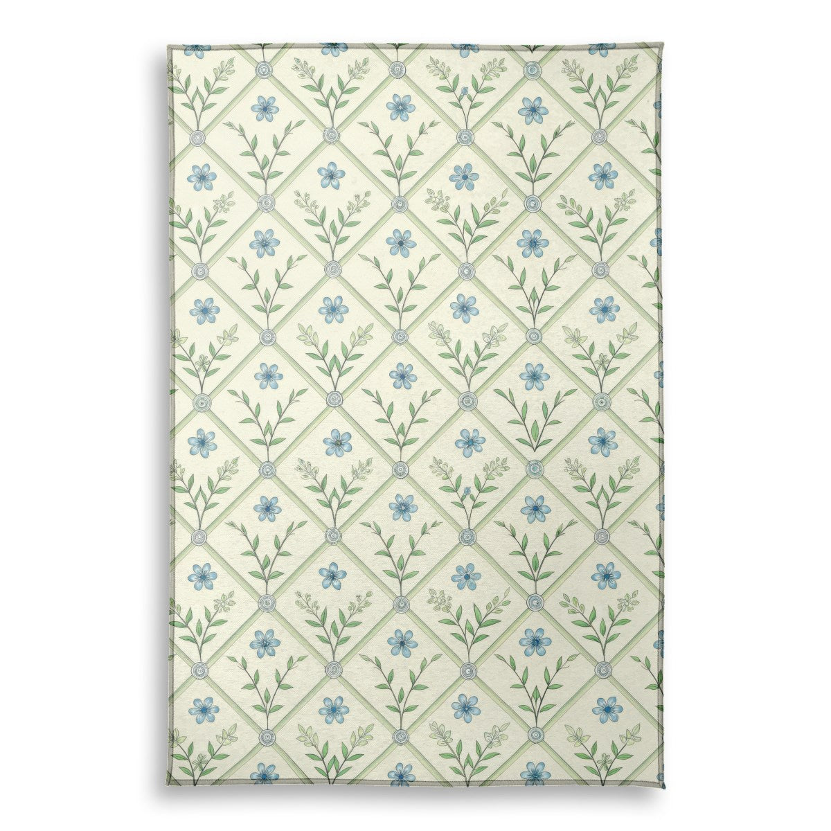 A seamless botanical pattern featuring a light green diagonal trellis on a cream background. The diamond shapes contain alternating motifs of a single blue flower and a leafy green sprig, creating a delicate, vintage-inspired design suitable for wallpaper or fabric.