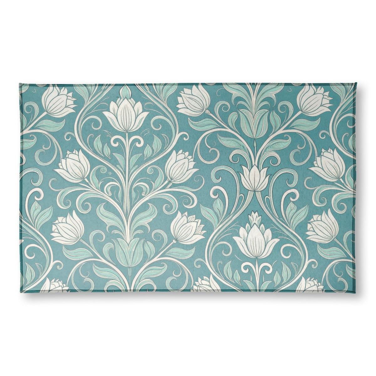 An elegant, symmetrical floral pattern in the Art Nouveau style. Stylized white and mint-green flowers are connected by swirling vines on a rich teal background, creating an intricate and decorative design reminiscent of vintage wallpaper.