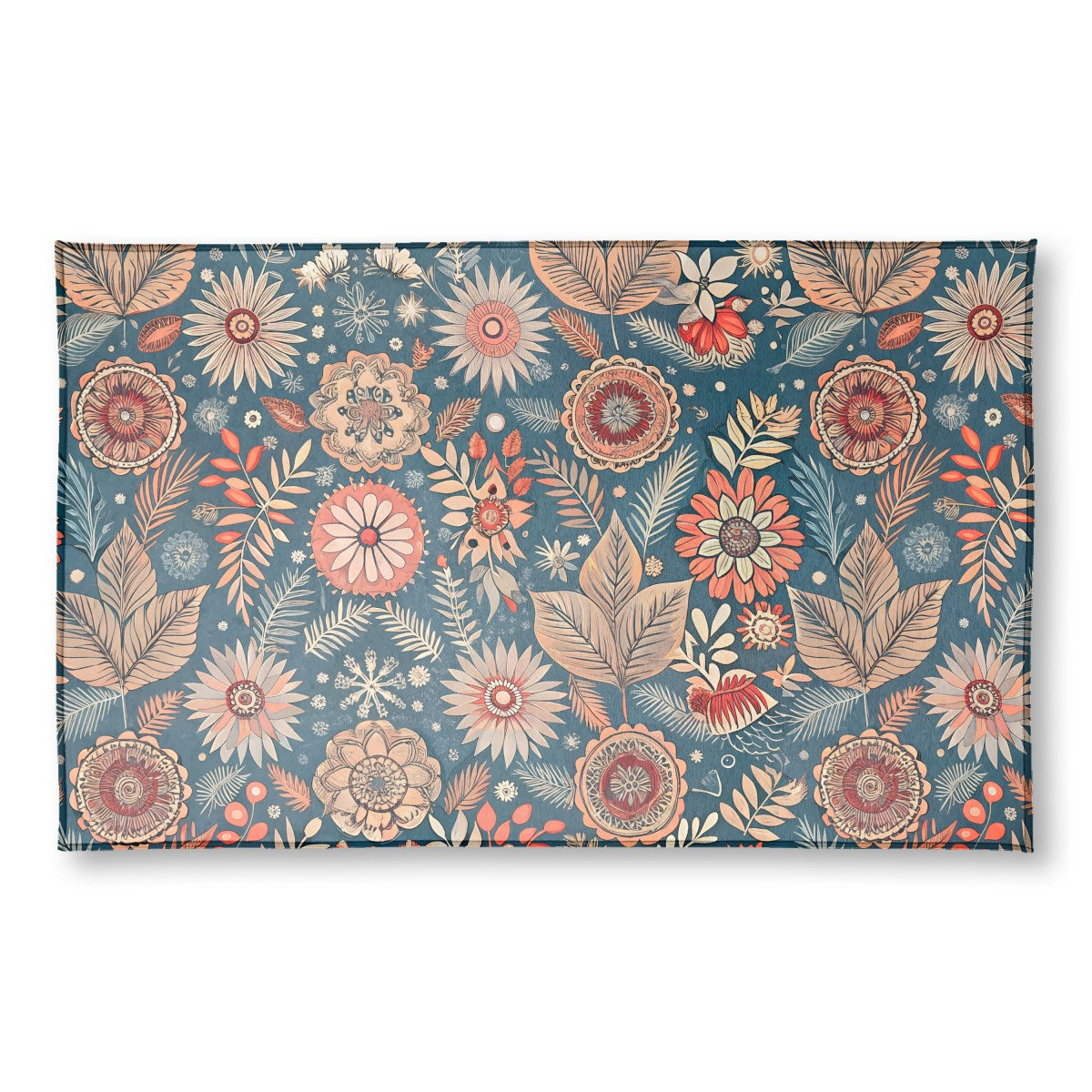 A dense, folk art-inspired pattern features stylized flowers, leaves, and ferns against a dark teal background. The illustration uses a warm, autumnal palette of rust, orange, and cream, creating a rich, vintage textile feel.