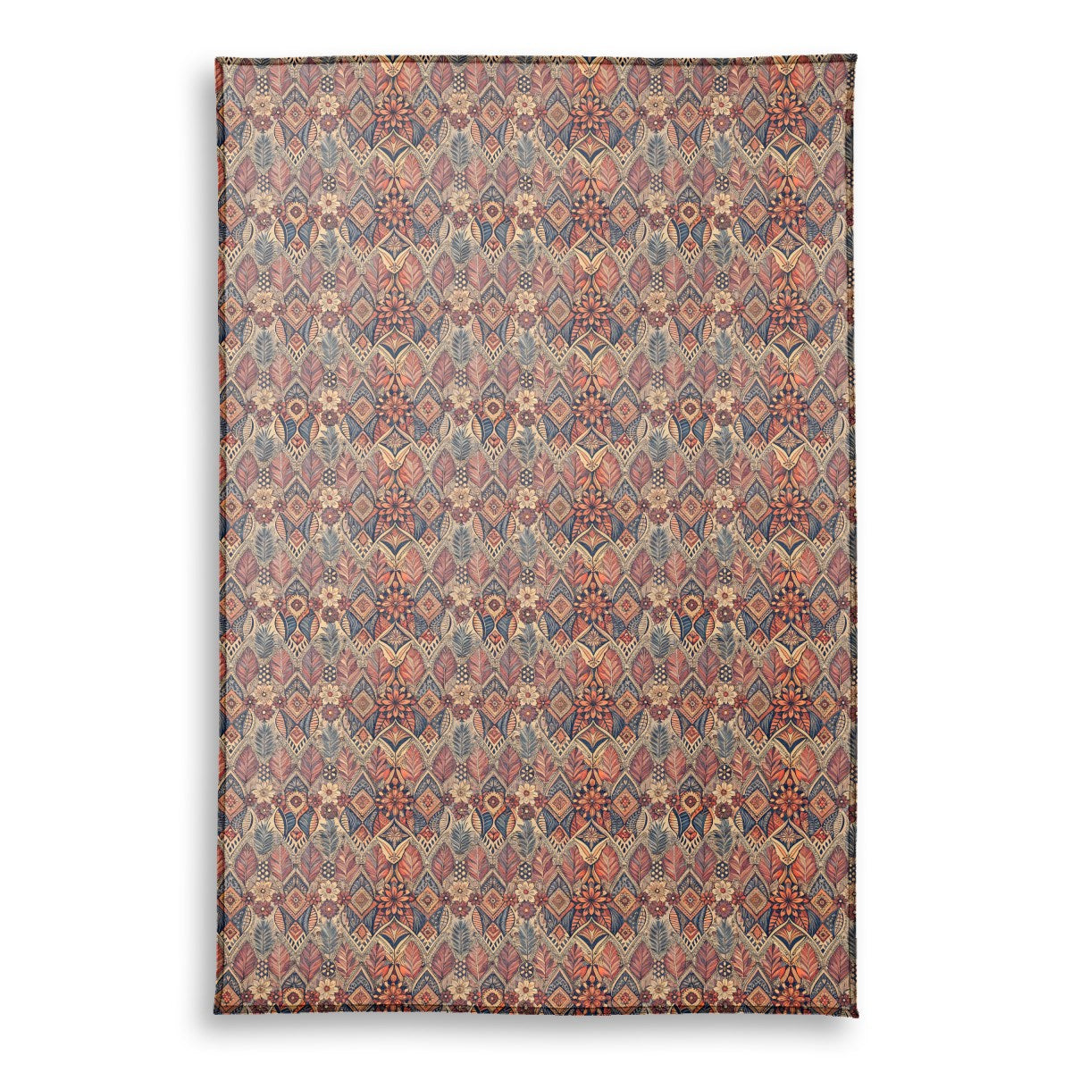 This is an intricate, hand-drawn bohemian pattern featuring a dense tapestry of feathers, flowers, and geometric motifs. The rich, earthy color palette of rust, orange, and navy blue creates a vibrant, folk-art-inspired design with a rustic feel.