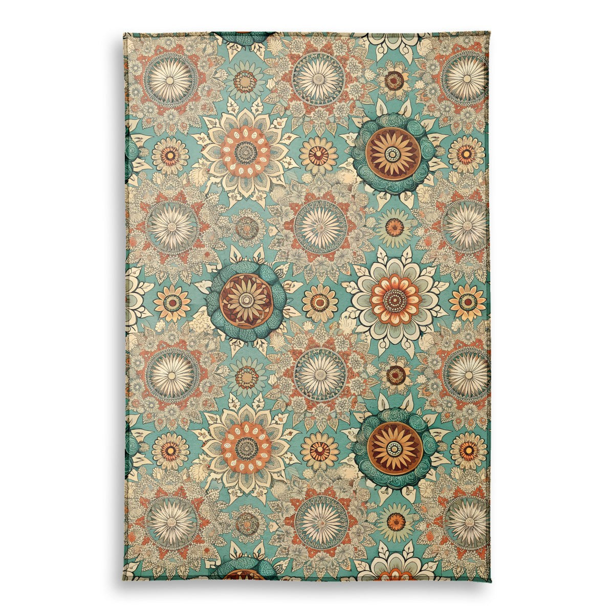 A vintage-style seamless pattern of intricate floral mandalas in a bohemian style. The design features a warm, earthy palette of orange, rust, and cream against a muted teal background, evoking the look of traditional block prints.